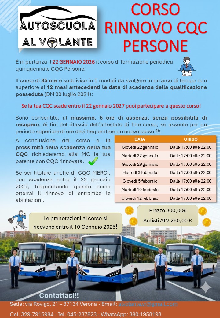 PROSSIMO CORSO RINNOVO CQC PERSONE IN PARTENZA IL 22 GENNAIO. TI ASPETTIAMO.